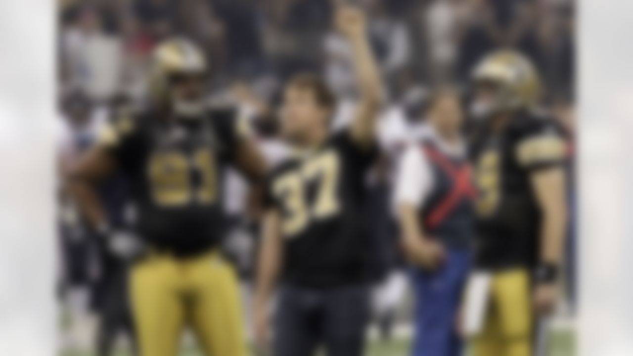New Orleans Saints place kicker John Carney, right, is congratulated by safety Steve Gleason after Carney kicked the winning field goal in overtime against the St. Louis Rams in St. Louis, Sunday, Sept. 26, 2004. The Saints won, 28-25. (AP Photo/Charles Rex Arbogast)