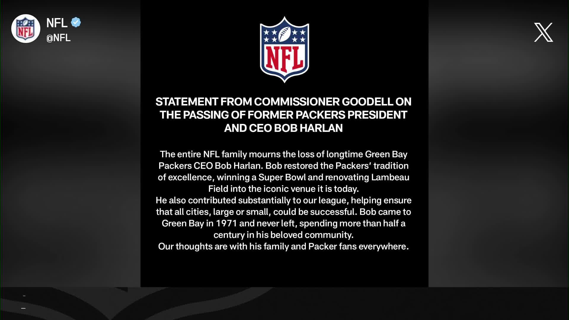 Roger Goodell issues statement on passing of former Packers President and CEO Bob Harlan