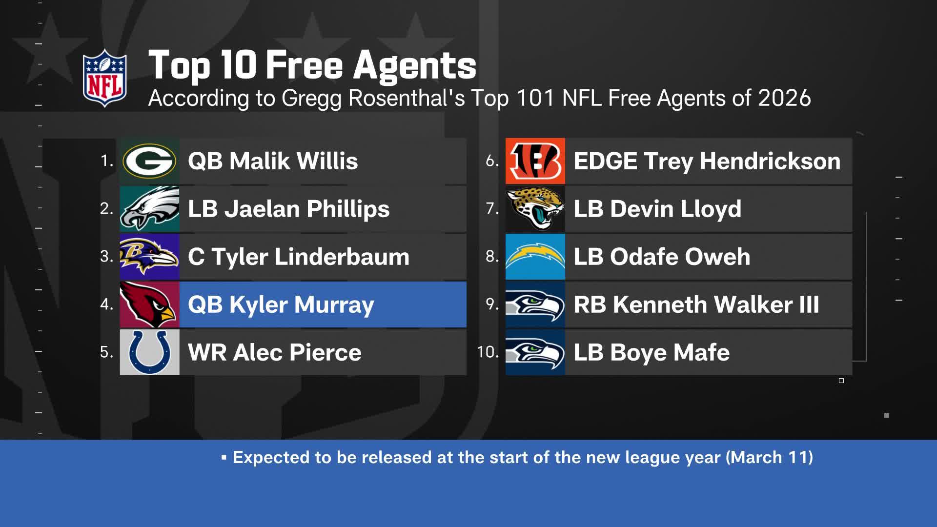 Best free agents available: Kyler QB2; nine WRs on list