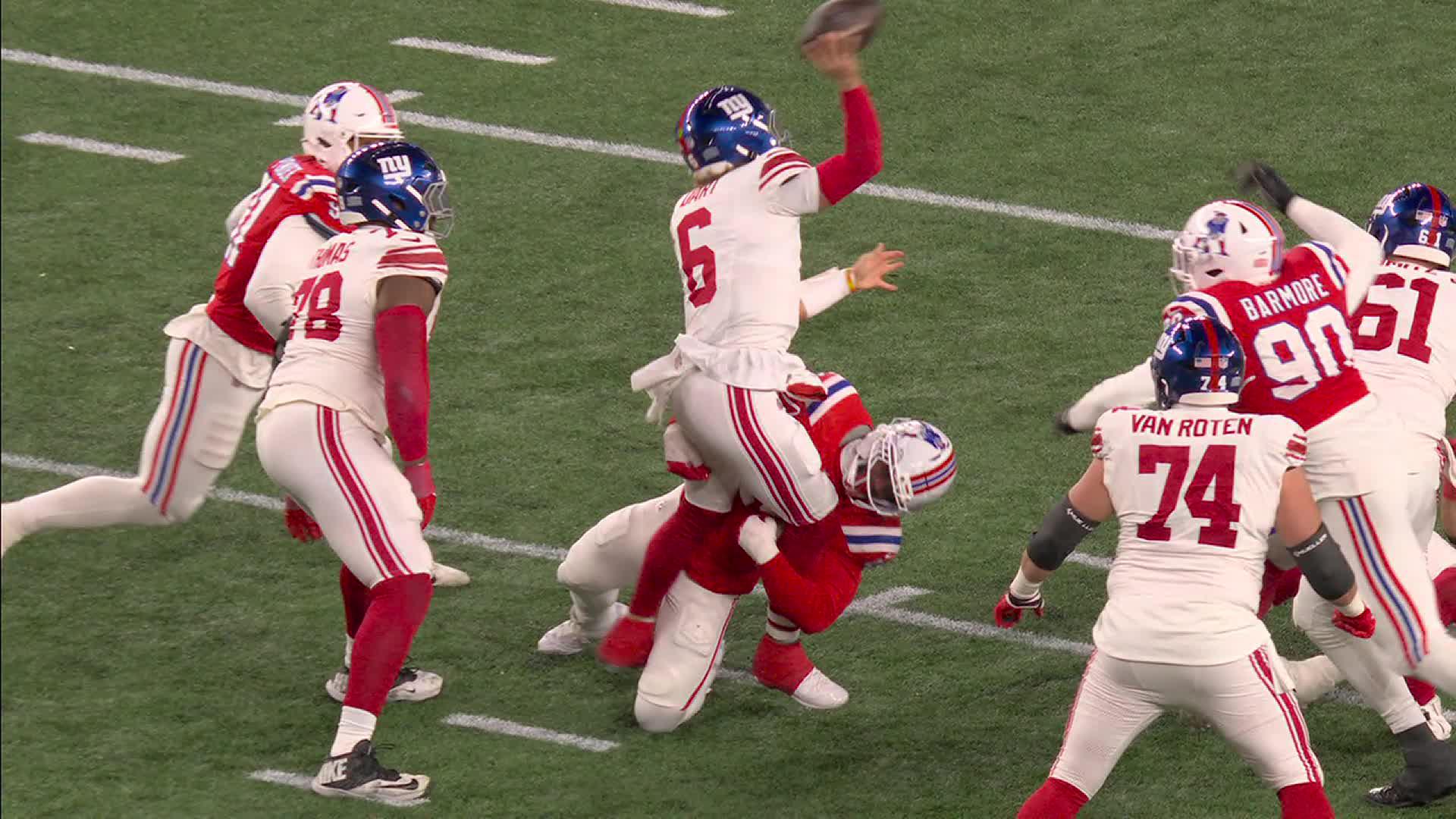 Jaxson Dart accidentally is caught by a Patriot to complete 4-yard pass to Hodgins