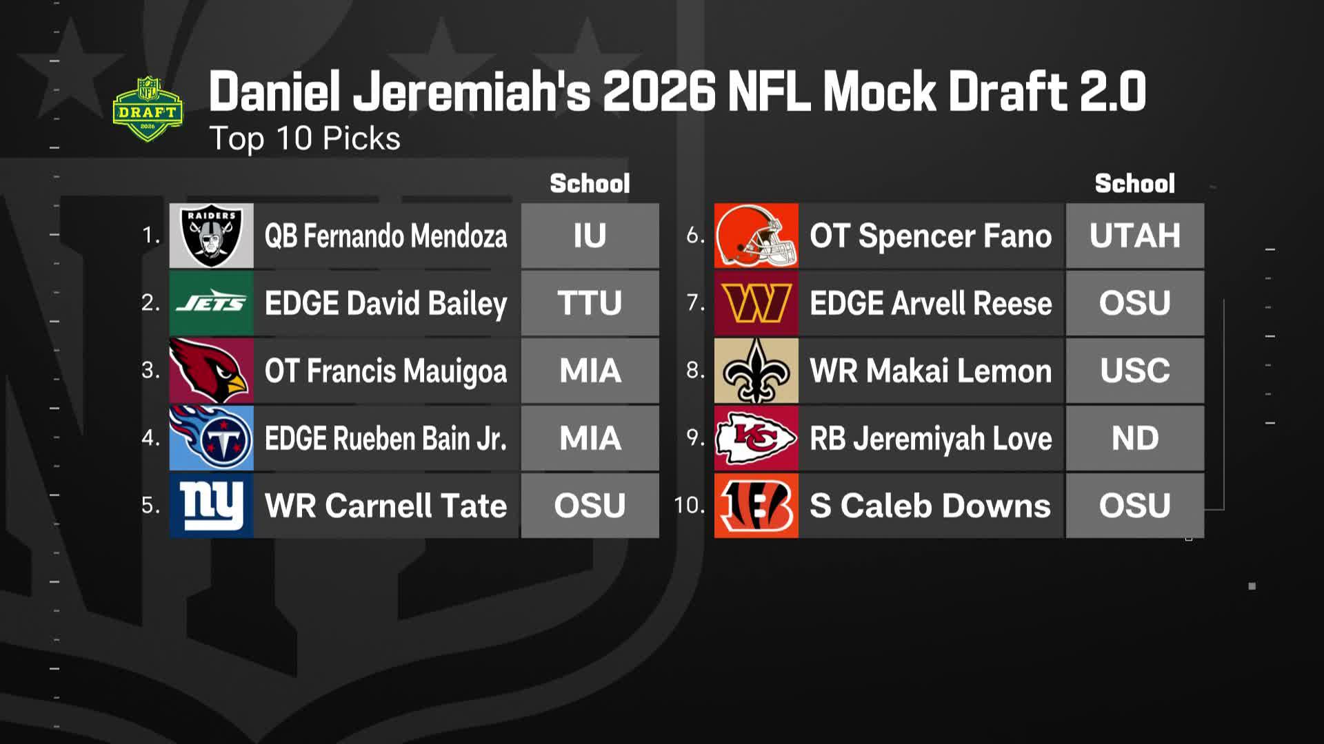 NFL Network analyst Daniel Jeremiah shares his top 10 mock draft ahead of the 2026 NFL draft.