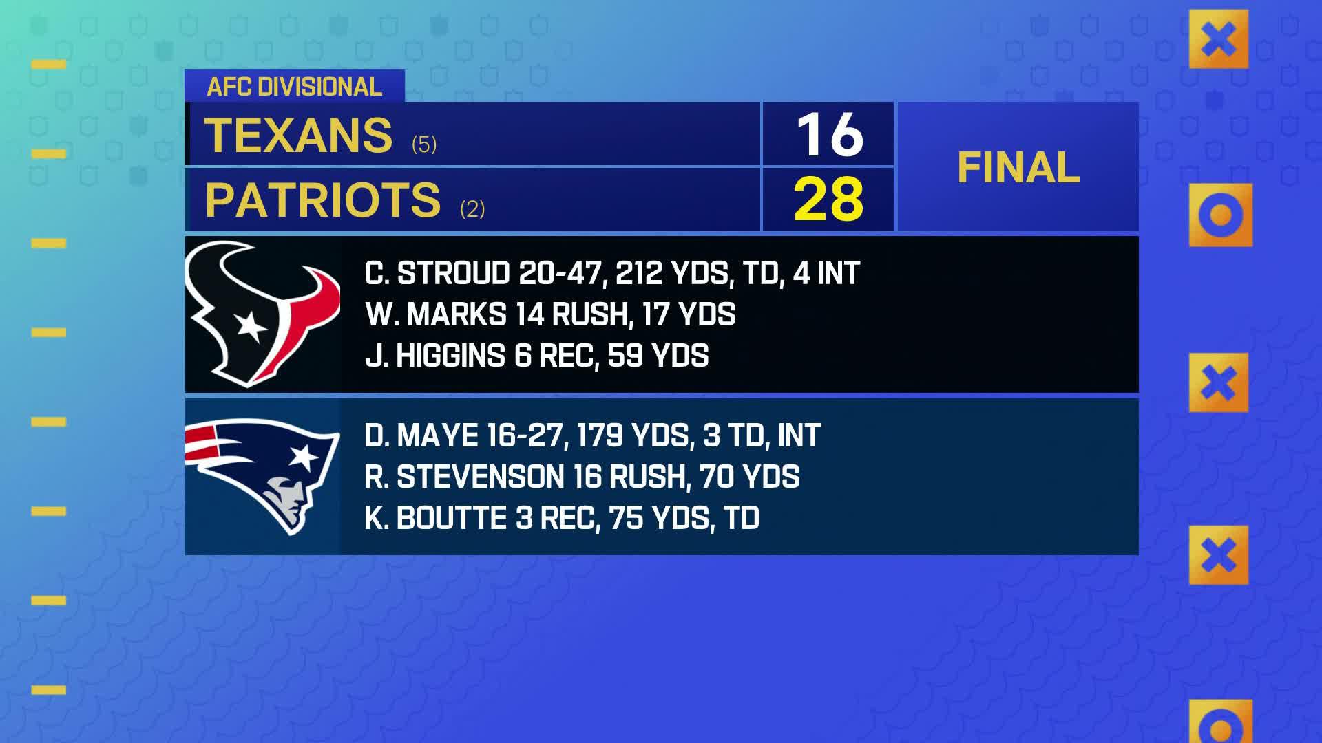 - Patriots force 5 turnovers to beat Texans, advance to AFC title game at DENPatriots beat Texans, advance to AFC title game at DEN